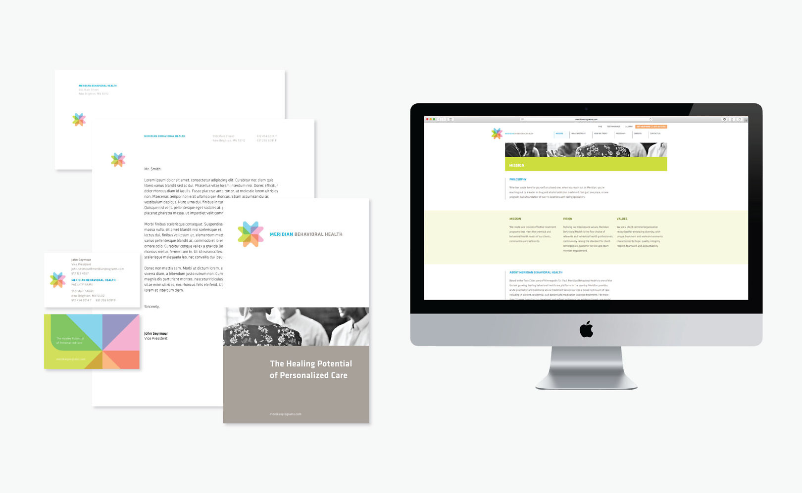 Cue worked with Meridian to clarify an umbrella mission statement able to preside over the entire organization and its many facilities. The core brand idea, “The Healing Potential of Personalized Care” signaled a shift from an industry standard of institutional-style care to a more optimistic view of mental health.