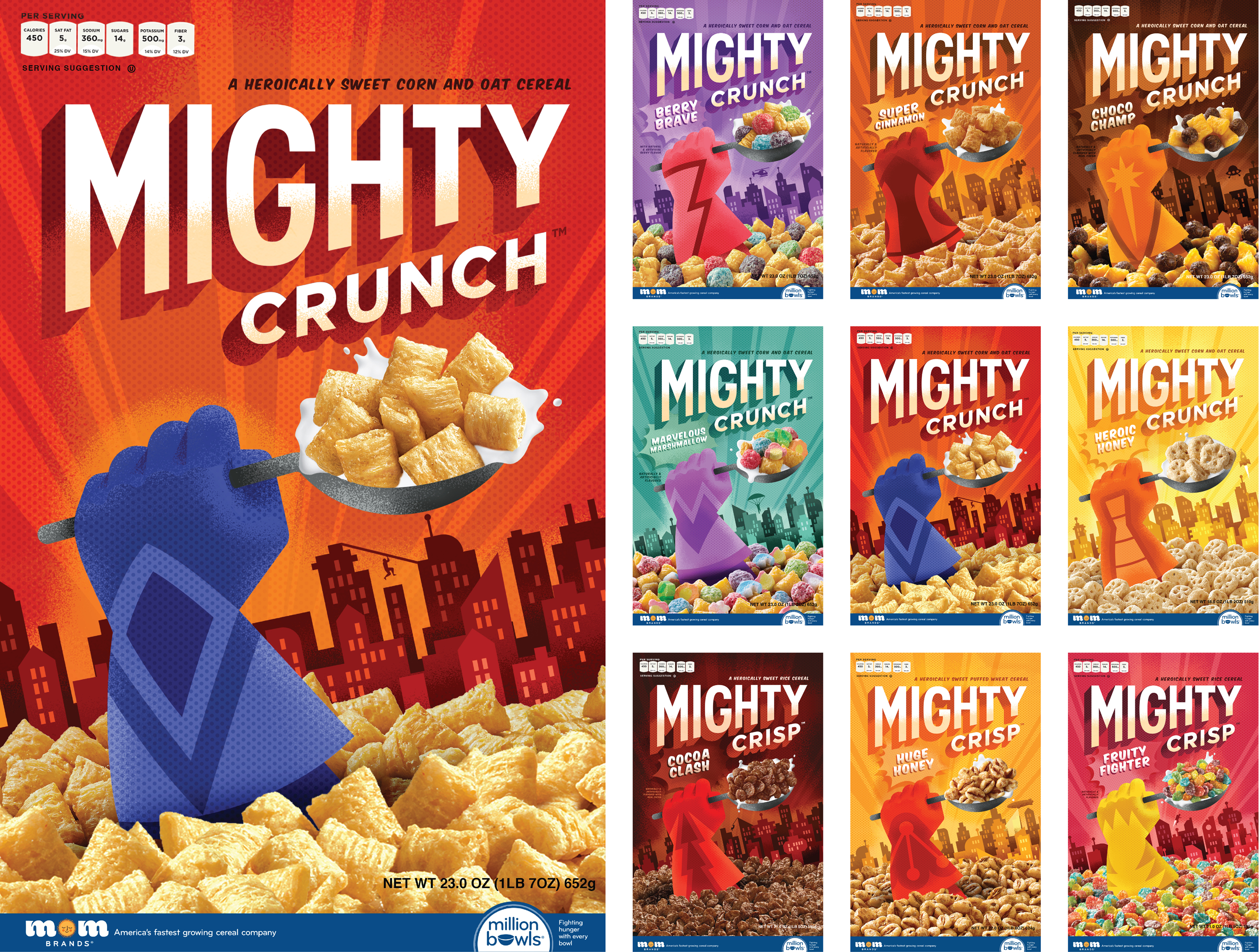 This new brand creation features an identity inspired by vintage comic book fonts, lending a superhero personality to the design. Illustrations by Luke Bott depict a giant gloved hand emerging from a sea of cereal, with a futuristic metropolis in the background. Color differentiation plays a key role in helping the Mighty Crunch flavors stand out on the shelf.
